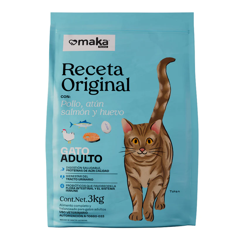 Maka Receta Original para gato contiene multi proteínas como el pollo, atún, salmón y huevo que proporciona una dieta altamente nutritiva, digestible y deliciosa. Todos los gatos merecen esta receta llena de sabor.